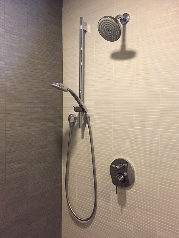 Porcelain mosaic tile shower with polished nickel finished fixtures.